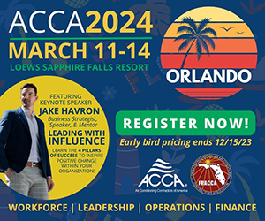 | | Sponsored | Join us in Orlando from March 11-14, 2024 for the 2024 ACCA Conference and Expo for HVACR Contractors and Businesses. |