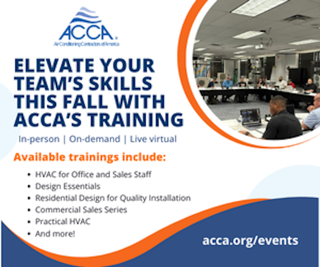 | | Sponsored | | ACCA's fall training lineup boosts contractor profitability. Each program tackles today’s challenges, with practical content for both the field and office. Better-trained technicians mean fewer mistakes, fewer callbacks, and faster problem-solving—putting more money in your pocket and less toward costly rework. Invest in training that pays for itself! |