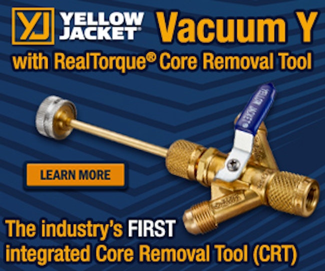 Sponsored | | Introducing the patent-pending YELLOW JACKET® Vacuum Y with RealTorque® Core Removal Tool (CRT) and Deluxe MaxFlow™ Evacuation Kit! Featuring the industry’s first “Y coupler” with an integrated CRT to remove the Schrader core and dramatically increase evacuation volume for faster system evacuations. Pair with the Deluxe MaxFlow™ Evacuation Kit and experience up to 10x faster system evacuations! |