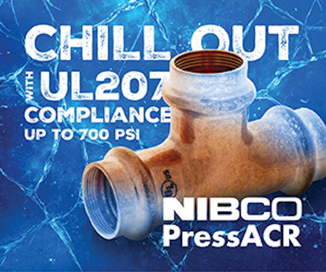 | | Sponsored | | NIBCO® PressACR® fittings and tools are designed to meet demanding environments with UL207 compliance up to 700 PSI. Our fittings are approved for air conditioning and refrigeration applications using A class refrigerants. Now available in sizes 1/4" – 2-1/8". |