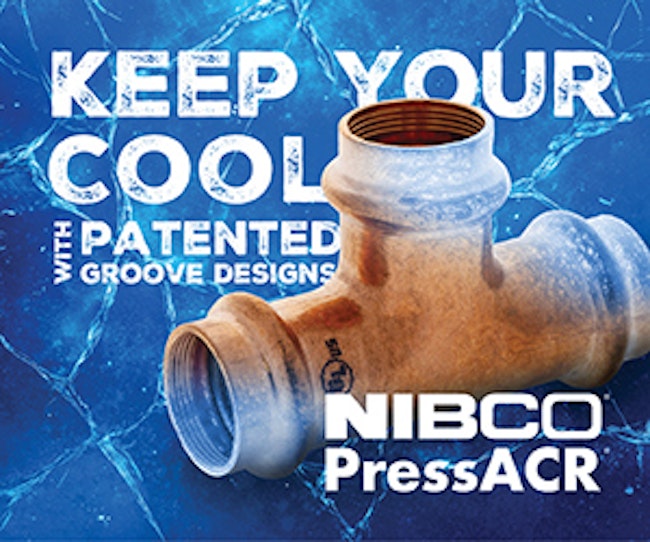 | | Sponsored | | NIBCO® PressACR® fittings and tools are designed to meet the demands of air conditioning and refrigeration applications. Our patent pending groove design and crimp pattern supports the higher pressure requirements of an HVACR system. Now available in sizes 1/4" – 2-1/8". |