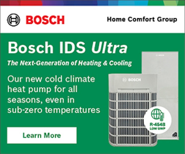 | | Sponsored | | Powered by Bosch inverter technology, the Bosch IDS Ultra Heat Pump is a cold climate heat pump that can provide 100% heating down to an outdoor temperature of 5° F and will continue to initiate heating even down to -13° F. Its Enhanced Vapor Injection (EVI) compressor borrows extra heat from the hot side of the refrigerant cycle, redirecting it to warm the home and keep your customers cozy! |